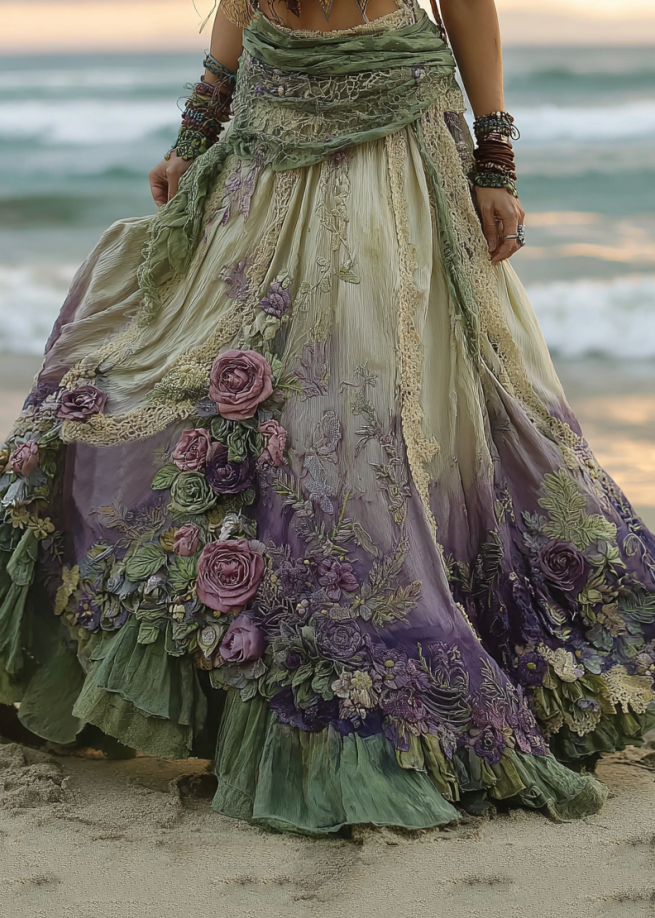 Vintage Boho Floral Patchwork Art Flowy Casual Linen Skirt