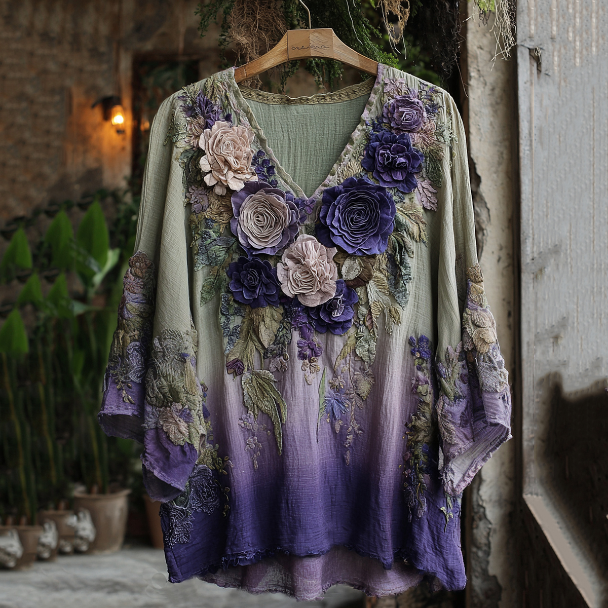 Vintage Classic Purple Lavender And Floral Embroidered Linen V Neck Shirt