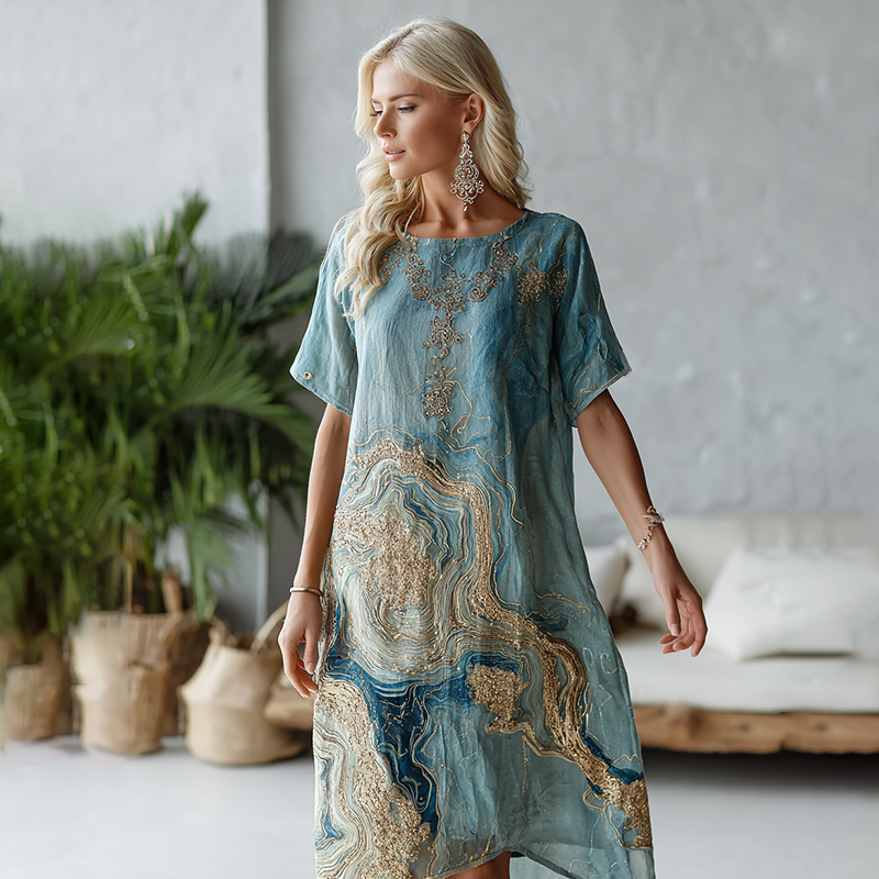 Vintage Marble Texture Collection Retro Bohemia Gradient Gilded Pattern Linen Dress