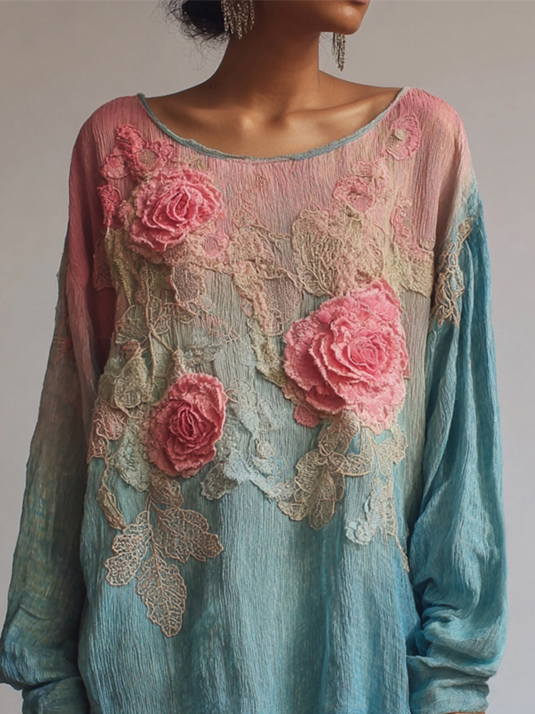 Vintage Pink Lace Rose Embroidered Gradient Linen Tunic