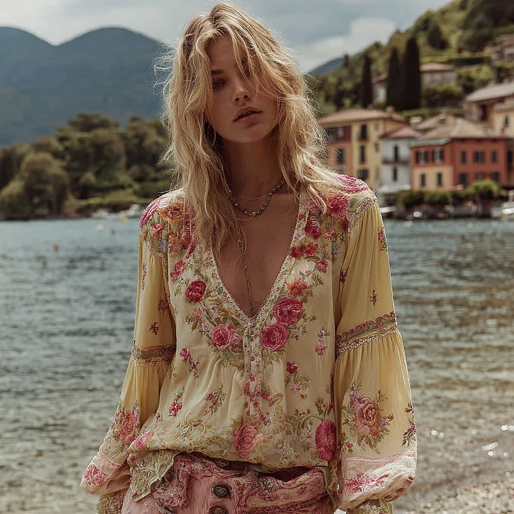 Vintage Rose Floral Embroidery Long Sleeve V-neck Shirt